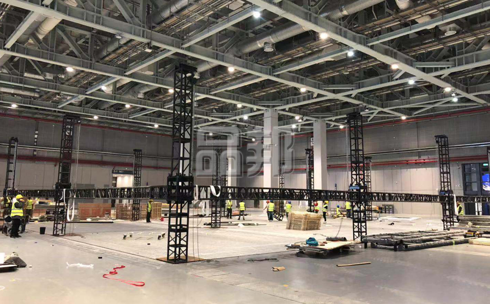 搭建前期需提前检查吊点所用的钩子大小是否与展架尺寸相符;